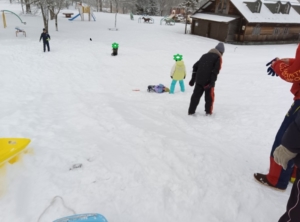 いつもより、お休みが多く寂しい気もしますが、子どもたちはいつも元気いっぱいです。ミニスキーにチャレンジするお友達、ソリで新コースを開拓する子、お兄さんに布を投げてもらいスタッフとビーチフラッグ対決的なことにチャレンジするお友達がいました。