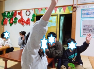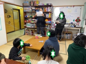 有志でケーキ作りをしてからクリスマス会を始めました。スタッフの説明をマナーよく聞いてから3択クイズをスタート。最初にクイズを出す係をしたい子供同士でくじを引きました。担当の子が元気よく原稿を読み上げて、答えの説明まで行いました。いつもは衝動性に引きずられふざけてしまう子も今日は丁寧な進行をしてくれました。
