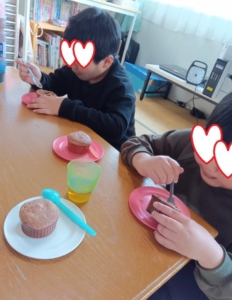 午後はからし種での活動です。バレンタインデーなので、女子3人でレンジで作れる『簡単フォンダンショコラ』を作りました。🍫💝