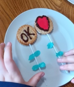 マシュマロを挟んだクッキーにチョコペンでメッセージをかきました。棒をつけて花にして袋に詰めて完成。