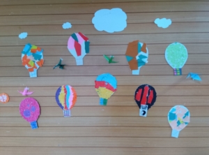気球の台紙を渡すと好きな色の折り紙を選び、早速、ちぎり始める皆さん。