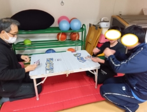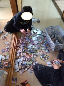 早めに来たお友達は、スタッフとデュエマ(カードゲーム)を楽しんでいました。カードの入った箱を片付けようとしたその時、ドーン!と箱の底が抜け、カードが床一面に散乱。すると自然とみんなが集まり、片付け?カード探し?が始まりました。
