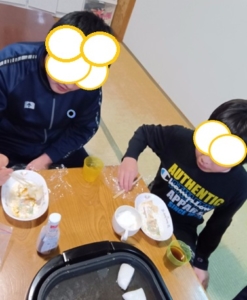 プレイルームで遊んだ後は、みんなでお餅を焼いて食べました。人数が少なかったこともあり、なんだか家族の団らんのような、ほっこりした時間になりました。