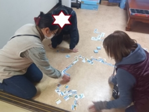 新しいゲームに誘われてチャレンジした女子は「コンタクトゲーム」にはまりました。テーブルでは足りずに、床一面でゲームが繰り広げられました。